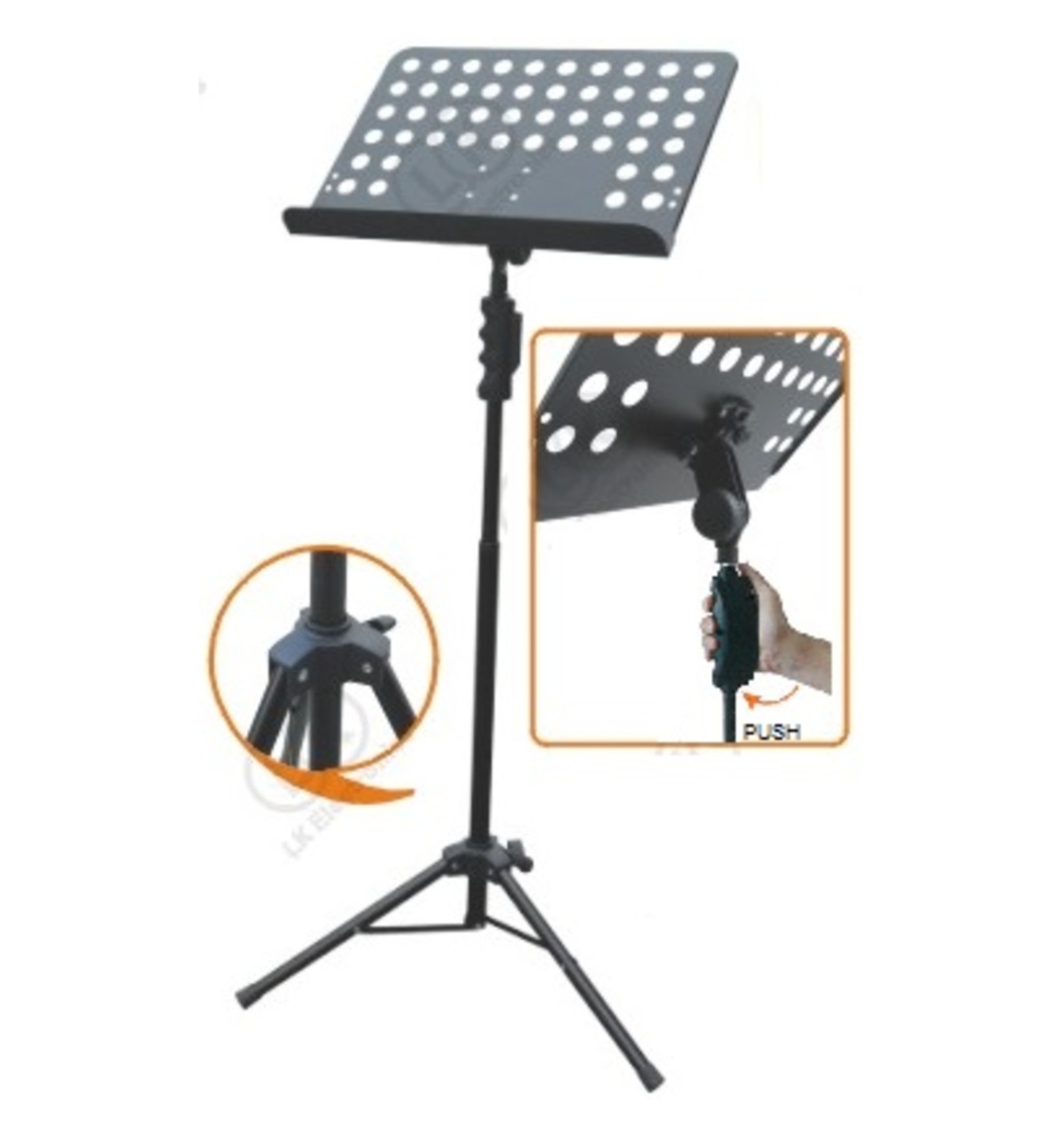 MUS032 ATRIL DIRECTOR Ajustable con una mano. Altura 940 mm - 1420 mm. Bandeja perforada 475 mm x 345 mm. Color negro. Caja completa: 5 unidades.