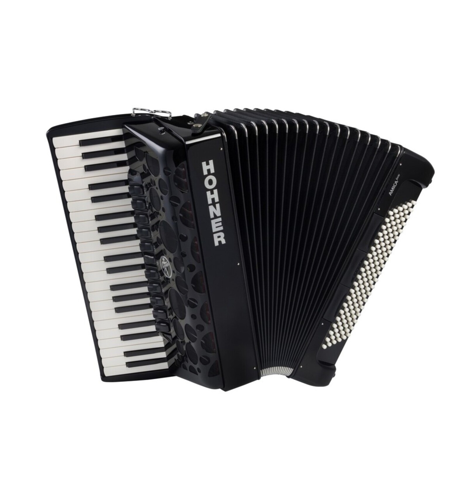 ACORDEON DE PIANO CROMATICO 120 Bajos , Peso de 9,8 Kg, 11 registros en el teclado de 41 teclas, y 3 registros en los bajos, 4 voces, Correa especialmente diseñada de nylon, Confunda