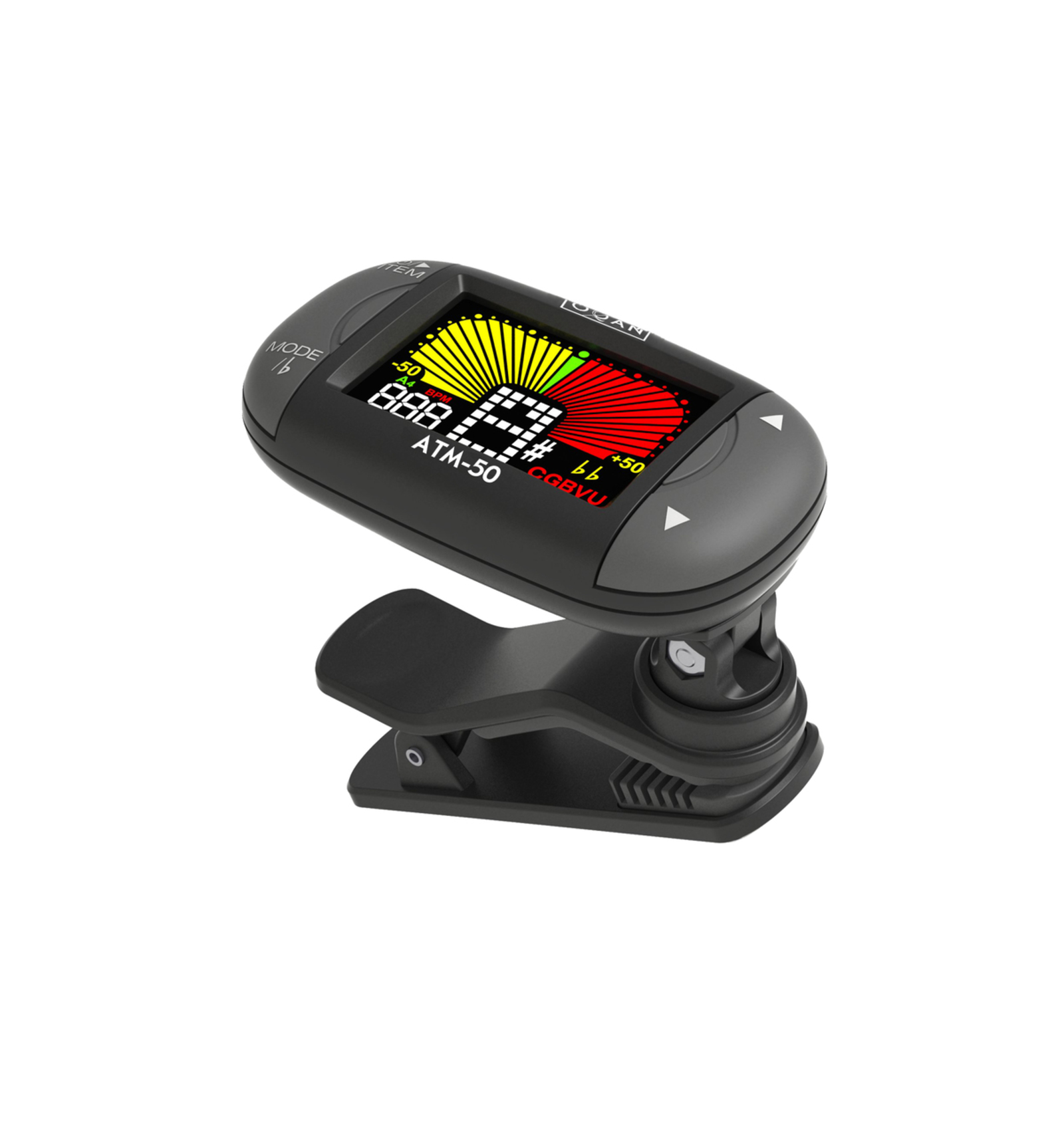 AFINADOR CROMÁTICO DE PINZA Afinador cromático y metrónomo. Display en color. Función reversible. Función de auto apagado después de 5 minutos sin actividad. Modos de afinación: Cromático, guitarra, bajo, violín y ukelele. Rango de afinación: A27,5Hz-4186 Hz. Modo afinación b, bb. Frecuencia seleccionable entre 430-450Hz. Precisión: +-1 centésimas. Funciones de Metrónomo: Beat: 0,1,2,3,4,5,6,7,8,9. Tempo: 30-250Bpm. Funciona con una pila de (3v CR2032). Dimensiones: 680(L)x 33 x 38(H)mm. Peso: 26g