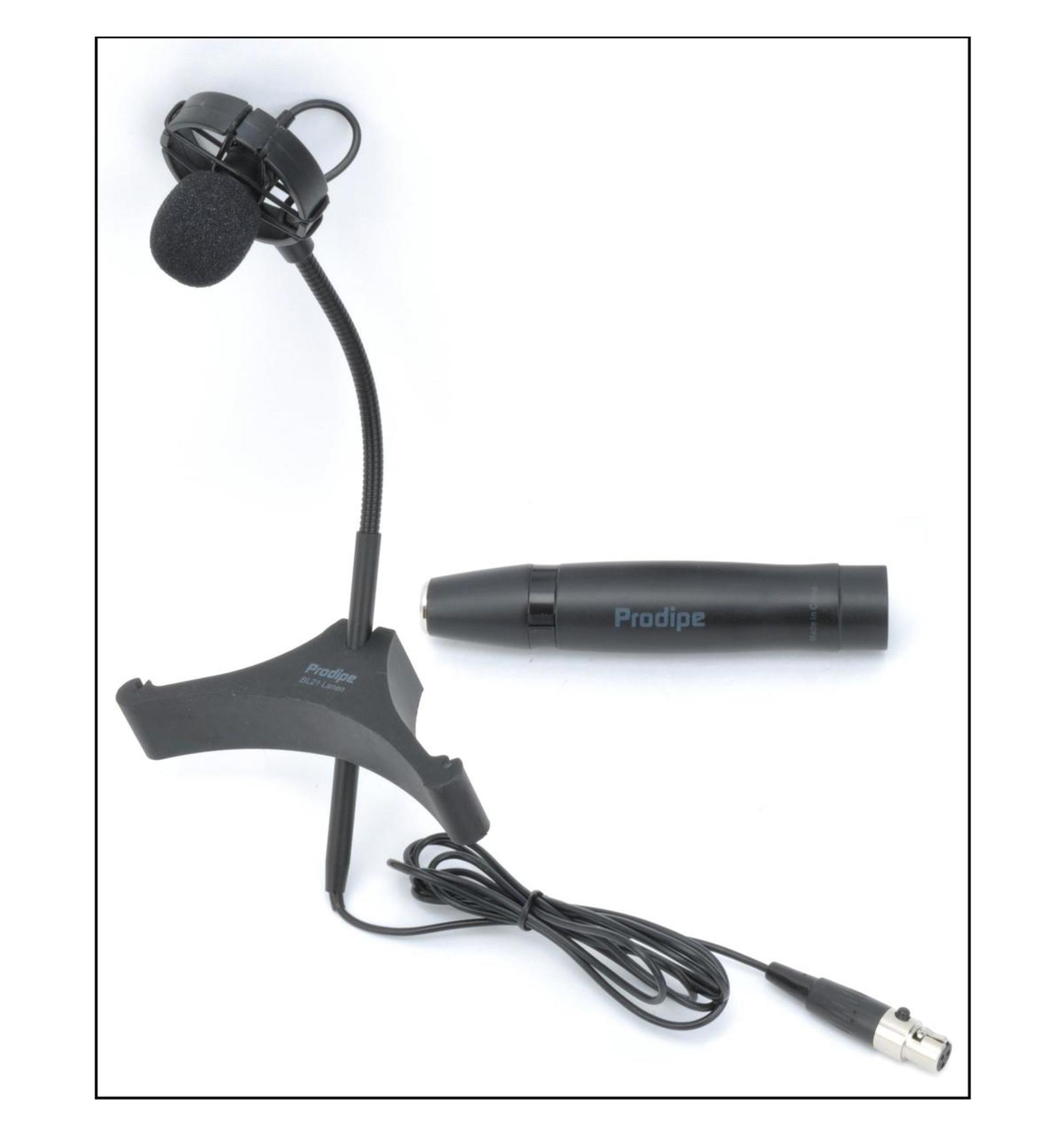 PRODIPE BL-21 Micrófono para Contrabajo. Sonido natural. Nivel de ganancia acústica alto (140dB). Con bajo nivel de acople. Adaptador mini XLR / XLR. Con pinza de goma que aisla las vibraciones del instrumento. Cuello de cisne adaptable para su ubicación. Para sistemas inalámbricos B210 de Prodipe y mesas de mezclas que dispongan de Phantom.