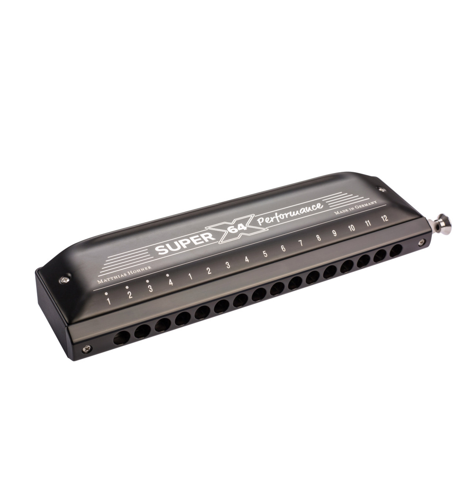 ARMÓNICA CROMÁTICA Armónica cromática de 64 voces, rango tonal de 4 octavas (C3 - D7) , lenguetas dobles de 1,2 mm. Color negro. La nueva Super 64X de Hohner actualiza la icónica cromática de Hohner con toda una serie de soluciones innovadoras. El systema VarioSrping permite un ajuste individual de la tensión en la palanca, mientras que el diseño de esta ofrece un funcionamiento practicamente silencioso. El estucheincluido sirve también como soporte para tareas de mantenimiento.