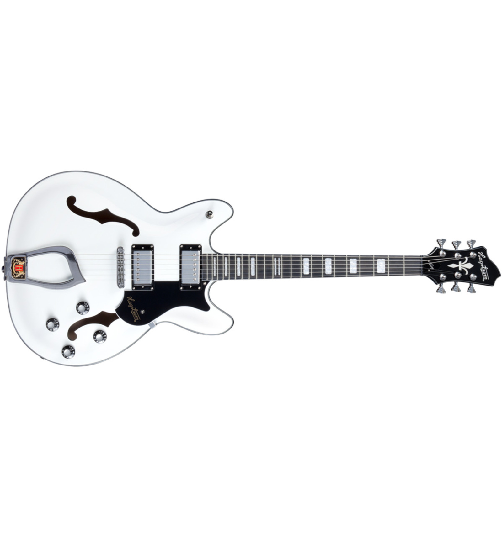 GUITARRA DE CUERPO SEMI-HUECO 'Viking - White Gloss, Contoured Ply-Maple Semi-Hollow body, Maple Set-Neck, Long throw T-O-M Bridge, Hagstrom Trapeeze, 2 x HJ50 Alnico 5, 2 x Vol RC-Circuit, 2 x Tone, 3-Way Pick-up Toggle Switch, 24.75'' Scale Length, H-Expander Truss Rod, 18:1 Hagstrom Tuners, Resinator Fretboard'