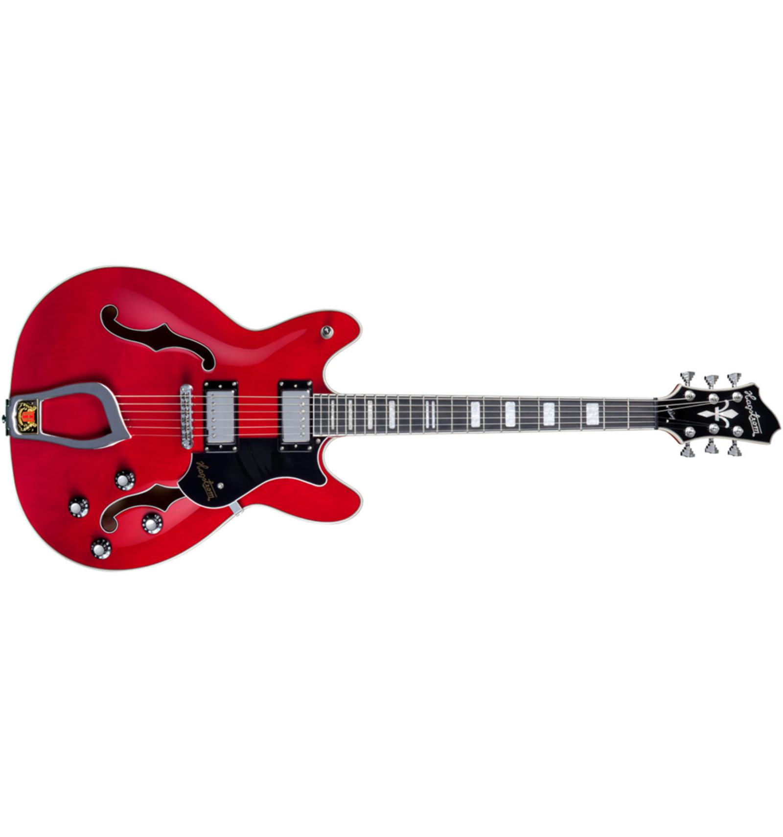GUITARRA DE CUERPO SEMI-HUECO 'Viking - Wild Cherry Transparent, Contoured Ply-Maple Semi-Hollow body, Maple Set-Neck, Long throw T-O-M Bridge, Hagstrom Trapeeze, 2 x HJ50 Alnico 5, 2 x Vol RC-Circuit, 2 x Tone, 3-Way Pick-up Toggle Switch, 24.75'' Scale Length, H-Expander Truss Rod, 18:1 Hagstrom Tuners, Resinator Fretboard'