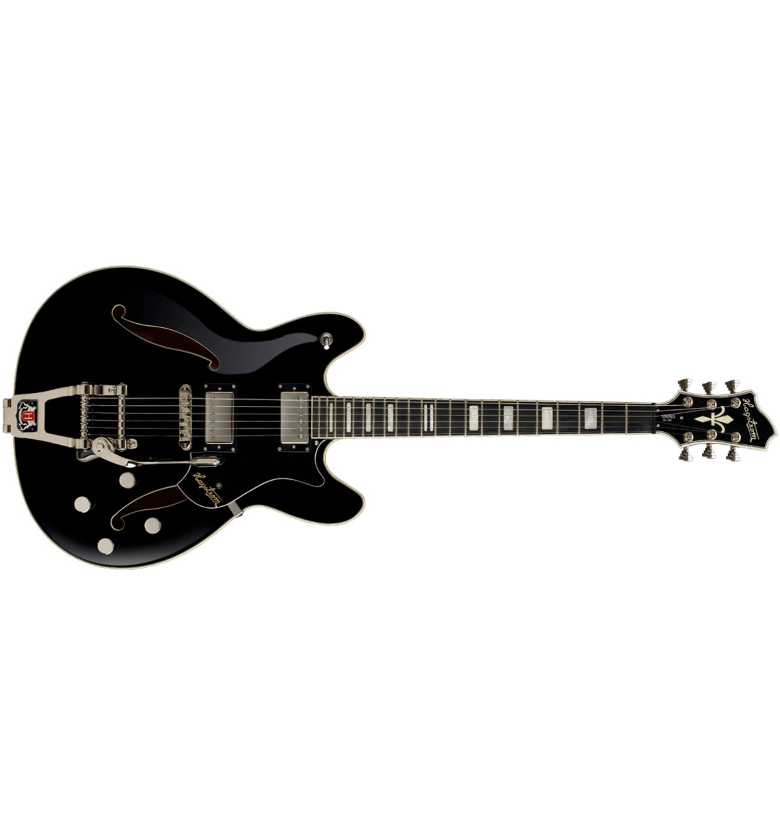 GUITARRA DE CUERPO SEMI-HUECO 'Tremar Viking DLX - Black Gloss, Contoured Ply-Maple Semi-Hollow body, Maple Set-Neck, Roller T-O-M Bridge, Hagstrom Tremar, 2 x HJ50 Alnico 5, 2 x Vol RC-Circuit, 2 x Tone, 3-Way Pick-up Toggle Switch, 24.75'' Scale Length, H-Expander Truss Rod, 18:1 Hagstrom Tuners, Resinator Fretboard'