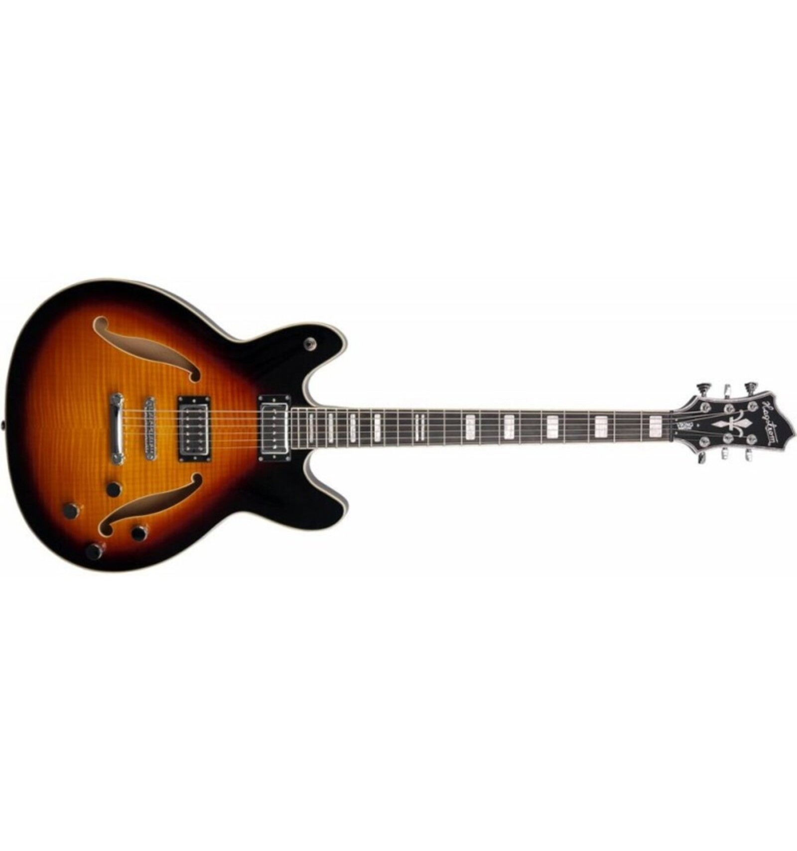 GUITARRA DE CUERPO SEMI-HUECO 'Viking Baritone DLX - Tobacco Sunburst, Contoured Ply-Maple Semi-Hollow body, Maple Set-Neck, Long throw T-O-M Bridge, Hagstrom Trapeeze, 1 x P-Urified (P-90) Alnico 5, 1 x Custom 58'C Alnico 5, 2 x Vol RC-Circuit, 2 x Tone, 3-Way Pick-up Toggle Switch, 28.00'' Scale Length, H-Expander Truss Rod, 18:1 Hagstrom Tuners, Resinator Fretboard'