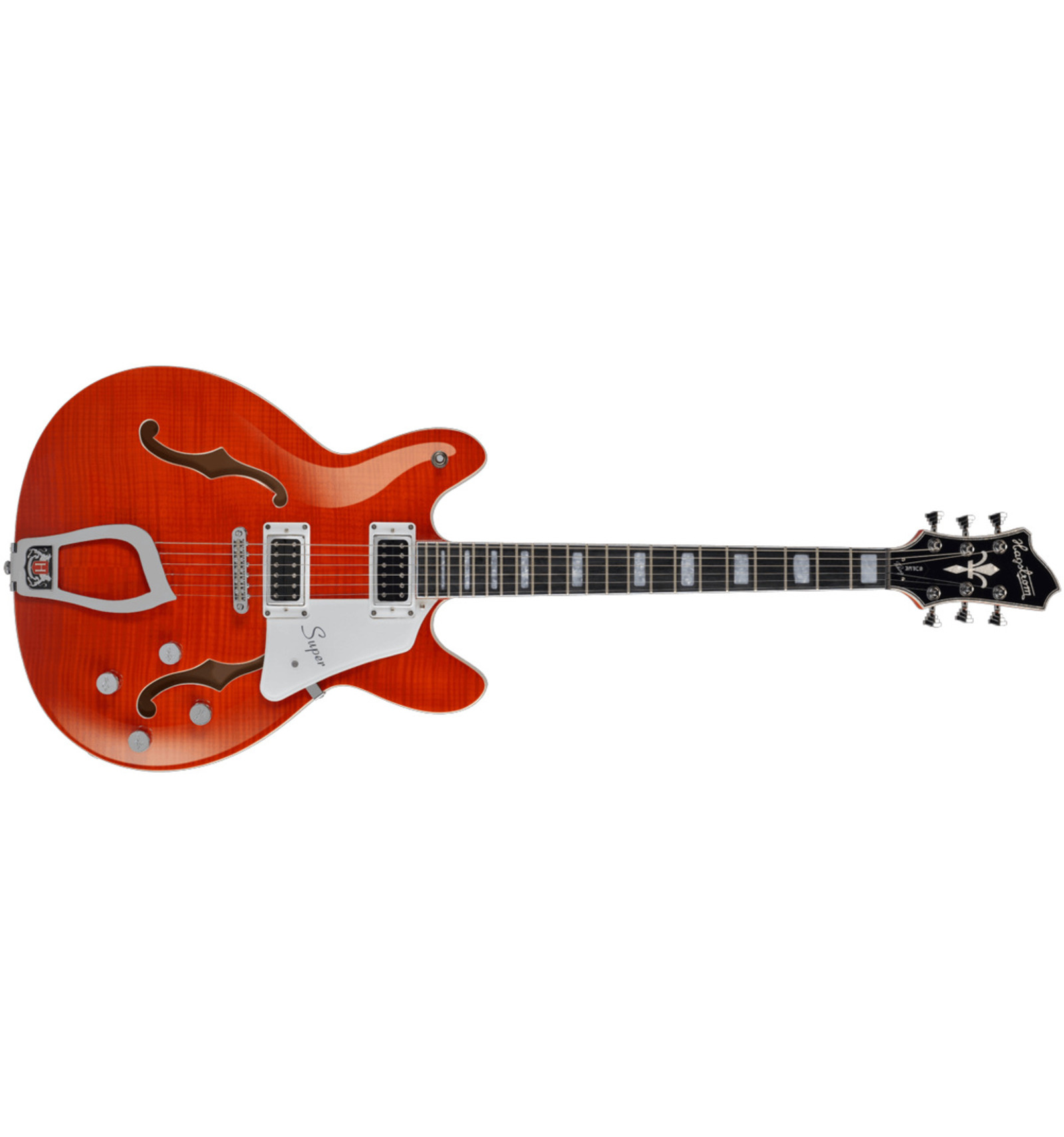 GUITARRA DE CUERPO SEMI-HUECO 'Super Viking - Mandarin, Contoured Ply Flame Maple Semi-Hollow body, Maple Set-Neck, Long throw T-O-M Bridge, Hagstrom Trapeeze, 2 x HJ50 Alnico 5, 2 x Vol RC-Circuit, 2 x Tone (Push/Pulls - Coil Split), 3-Way Pick-up Toggle Switch, 25.50'' Scale Length, H-Expander Truss Rod, 18:1 Hagstrom Tuners, Resinator Fretboard'