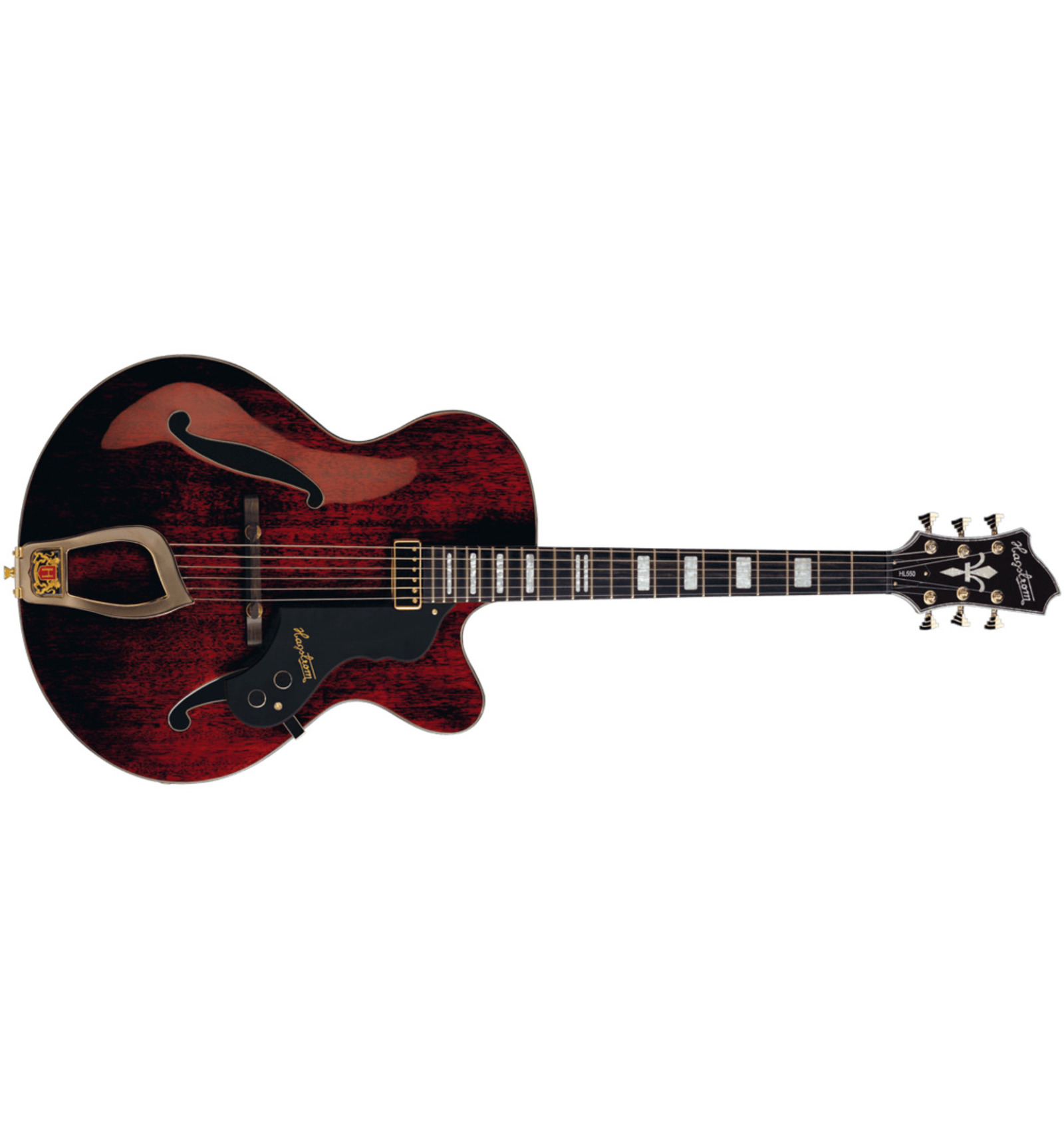 GUITARRA DE CUERPO HUECO 'HL-550 - Natural Mahogany Gloss - Contoured Mahogany Ply Hollow Body, Mahogany Set neck, Resinator Floating Bridge, Hagstrom Trapeeze, 1 x HF50, 1 x Vol RC-Circuit, 1 x Tone, Scale Length 24.75'', H-Expander Truss Rod, 18:1 Hagstrom Tuners, Resinator Fretboard'