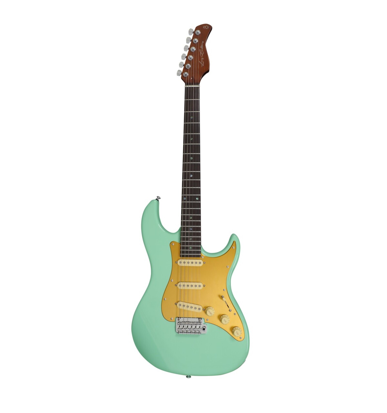 GUITARRA ELÉCTRICA ST Guitarra eléctrica Larry Carlton tipo Strat. Cuerpo de aliso. Mástil de arce tostado C-shape, acabado satinado. Diapasón de palosanto, con trastes redondeados para mayor comodidad. Escala: 648mm (25.5’’). Mástil atornillado (Bolt-on). Radio del diapasón: 241 mm (9,5''). 22 trastes Medium Jumbo. Cejilla de hueso, anchura 42mm. Pastillas LC Super-V SSS. Controles de Volumen y Tono. Selector de 5 posiciones. Clavijeros con bloqueo Sire Premium Locking. Puente S7V 2-post. Herrajes cromados. Golpeador: Aluminio dorado. Acabado: Mild Green