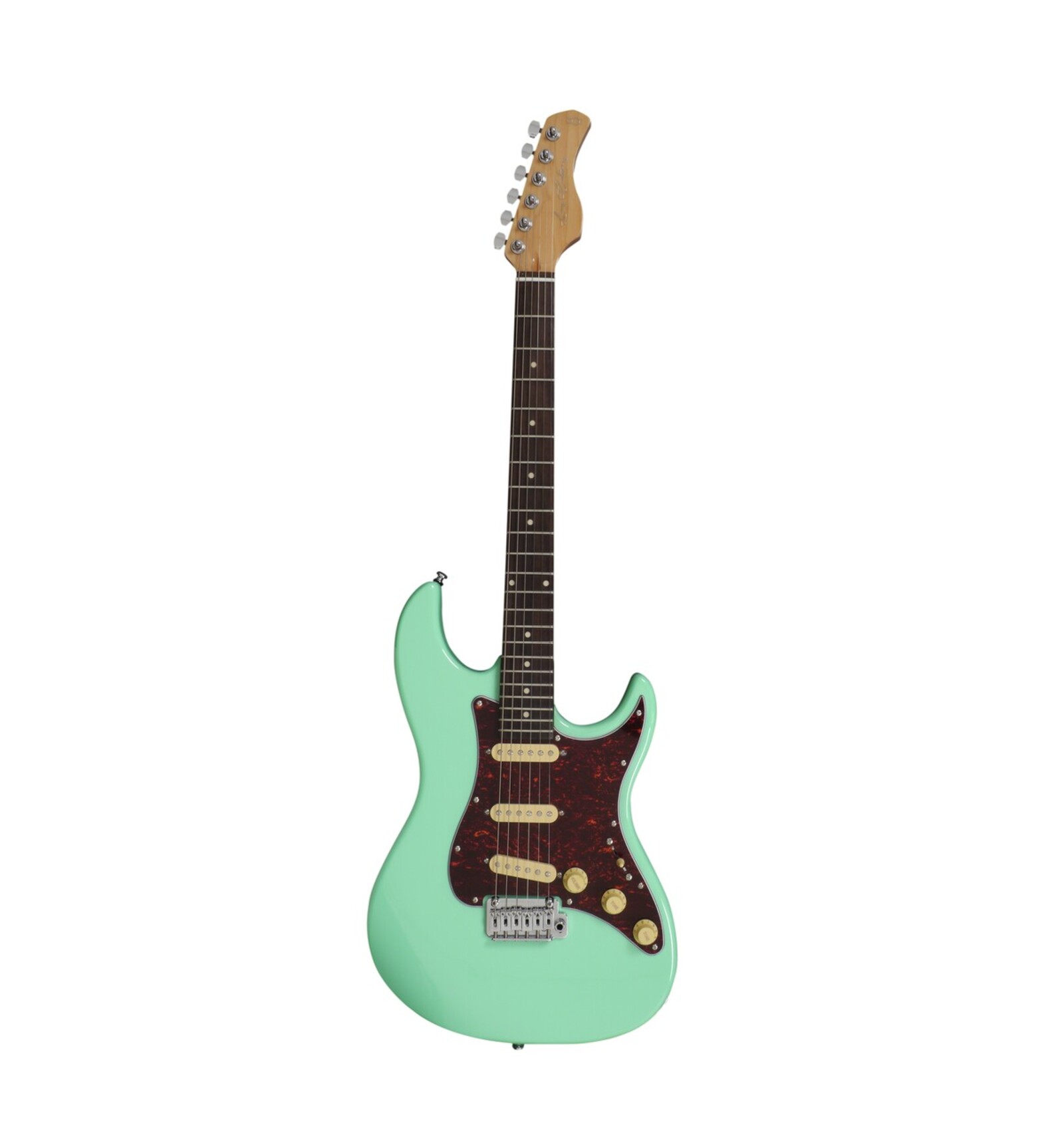 GUITARRA ELÉCTRICA ST Guitarra eléctrica Larry Carlton tipo Strat. Cuerpo de caoba. Mástil de arce C-shape, acabado satinado. Diapasón de palisandro, con diapasón y trastes redondeados para mayor comodidad. Escala: 648mm (25.5’’). Mástil atornillado (bolt-on). Radio del diapasón: 241 mm (9,5''). 22 trastes Medium Jumbo. Cejilla de hueso, anchura 42mm. Pastillas: Sire Standard-ST Pickup Set, configuración con 3 pastillas de bobina simple. Controles de Volumen y dos de Tono. Selector de 5 posiciones. Clavijeros Sire Standard Tuner. Puente: Sire Standard Tremolo Bridge (2 Post Type). Herrajes cromados. Golpeador: Tortoise. Acabado: Mild Green.