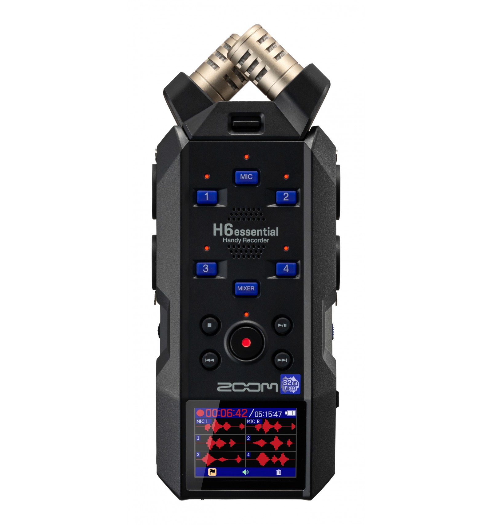Grabadora digital de 6 pistas – nuevo sistema de cápsulas 3.0 que admite 32 bits – Cápsula XYH-6e incluida: 2 micrófonos de condensador en configuración X/Y a 90º, hasta 135 dB SPL + entrada lateral mini-jack de 3,5 mm de micrófono/línea con alimentación PiP para micrófonos lavalier - Cuatro entradas combo jack/XLR de micrófono/línea de 6,35 mm con preamplificadores de alta resolución y alimentación fantasma de +48 V - Formatos de grabación: WAV coma flotante de 32 bits, 44,1/48/96 kHz - Grabación en tarjetas microSDHC/microSDXC de hasta 1 TB - Pantalla LCD de 2" - Puerto adaptador bluetooth BTA-1 (opcional) que ofrece control remoto a través de un smartphone iOs y sincronización UltraSync Blue - Puerto USB Type-C tipo High Speed 2.0 class compliant, compatible con Mac, PC e iOs - Funciones USB: Lector de tarjetas, interface de audio de 2 o 6 entradas/2 salidas en 24 o 32Bits @ 44,1 o 48kHz - Salida para auriculares jack estéreo de 3,5 mm - Altavoz mono de 500mW/8Ω - Funciona con 4 pilas LR6/AA (no incluidas, duración de la batería de hasta aproximadamente 18 horas en estéreo/48 kHz) o fuente de alimentación AD-17 (opcional)