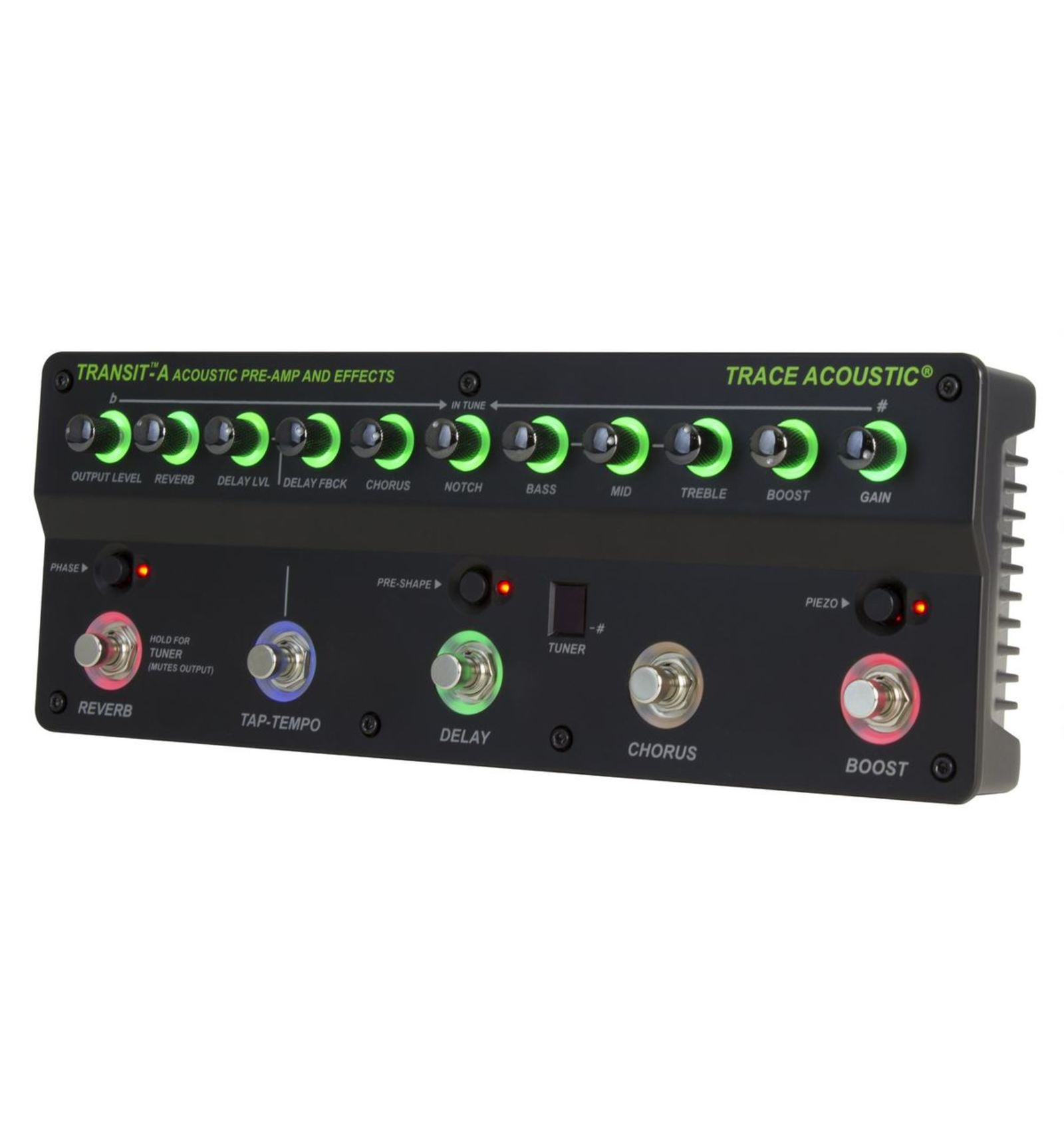 PEDALERA MULTI-EFECTOS DE SUELO Transit A. Preamplificador y multiefectos para guitarra acústica en formato pedal. Controles retroiluminados, afinador cromático integrado, selector piezoeléctrico para aumentar la impedancia de entrada. Chorus con fácil ajuste con un solo knob. Delay con ajustes de nivel, Feedback y Tap-Tempo. Ecualizador de 3 bandas activo con selector de preset para EQ clásica de Trace Elliot. Reverberación ajustable, selector de inversión de fase. Controles de ganancia y salida. Salidas estéreo, salida sin procesar , salidas XLR pre y post balanceadas con toma a tierra. Entrada auxiliar y salida de auriculares. Dimensiones 31.2Lx11.4Px5.84H - Peso aprox. 1.18 Kg. Bolsa de transporte incluida.